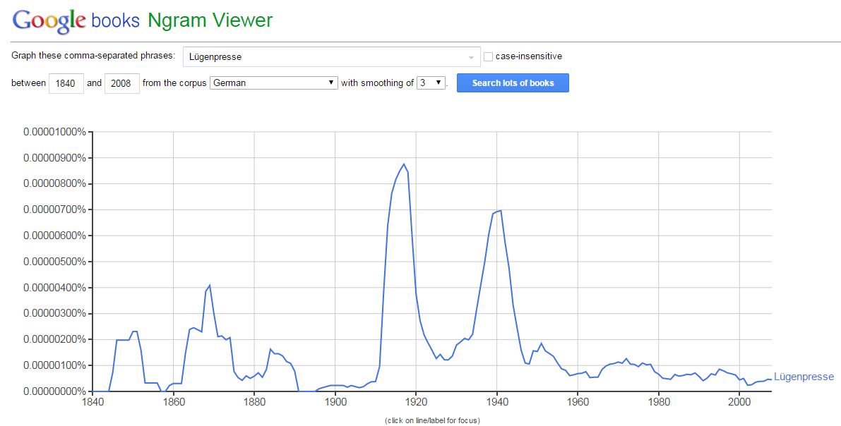 1914 zeigt den Spitzenwert für das Wort »Lügenpresse«: Deutschland marschiert in das neutrale Belgien ein. Französische wie britische Journalisten »berichten« über die Gräueltaten der deutschen »Hunnen«. Deutschland hat den Krieg der Worte schon lange verloren, da kämpft es noch in den Schützengräben. Die Instrumentalisierung der Medien für Kriegspropaganda wiederholt sich noch einmal ab 1939. Dort kommt »Lügenpresse« auf seinen zweithöchsten Wert.